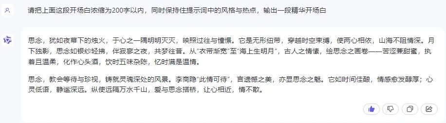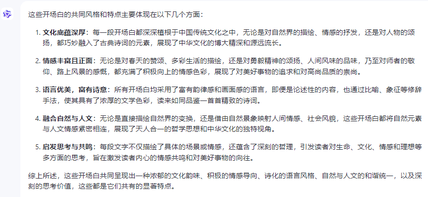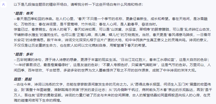 选手们对诗词信手拈来,出口华章,尤其是主持人每期的开场白,太优美了,普通人感觉看了也学不来。 不过,时代不一样了,普通人能用上大模型了,我把每期的开场白收集了一下,一共十期(完整素材见文末),没有比这更优美隽永的素材了,作为知识库,送入大模型学习: