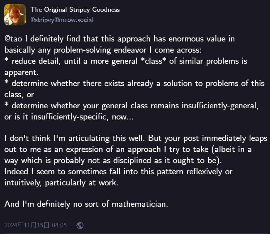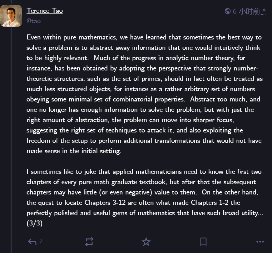 陶哲轩还提到,在纯数学中,故意忽略一些直觉上看似非常重要的信息非常有帮助。