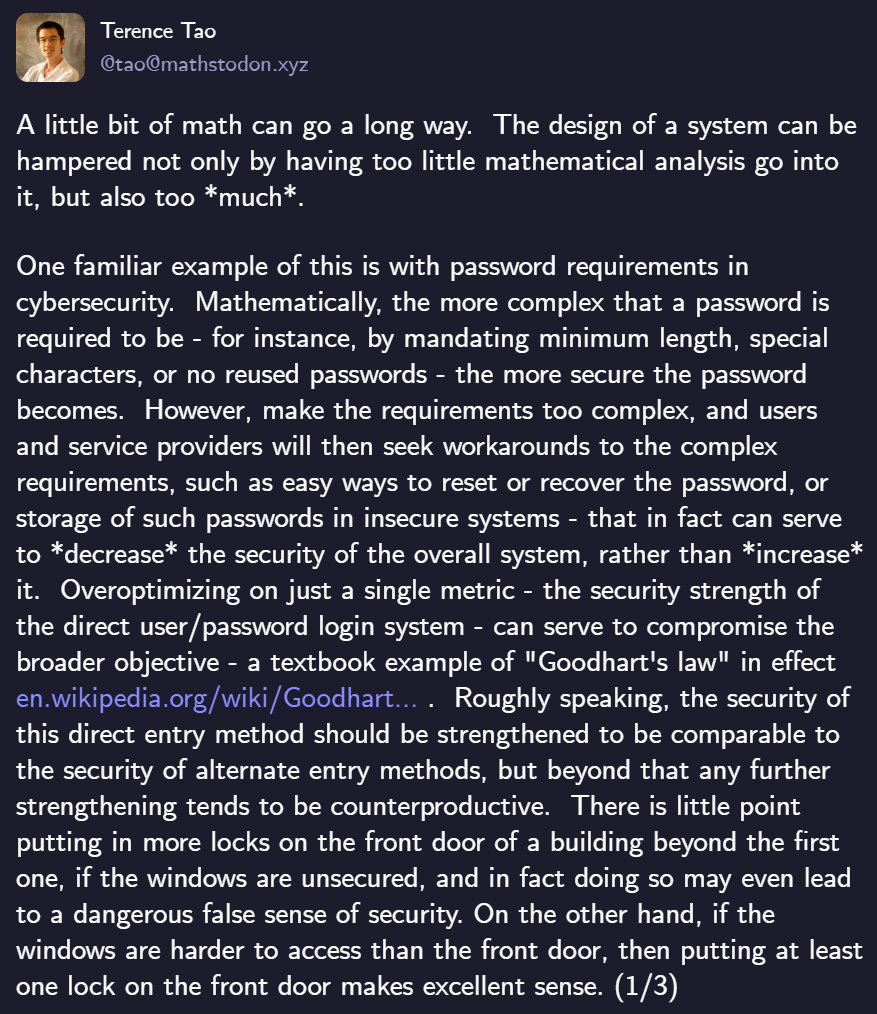 文中谈到了一个关于「度」的问题,陶哲轩表示在设计系统时,缺乏或者过度的数学分析可能都会适得其反,所以要适度。