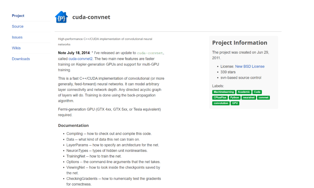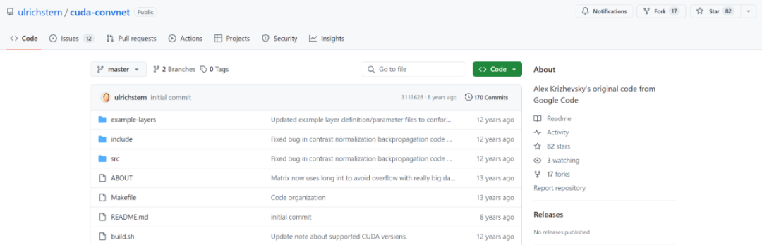 在帖子中,Karpathy 提到:有一个有趣的事实是,很多人可能听说过 2012 年 ImageNet/AlexNet 的时刻,以及它开启的深度学习革命。不过,可能很少有人知道,支持这次竞赛获胜作品的代码是由 Alex Krizhevsky 从头开始,用 CUDA/C++ 手工编写的。这个代码仓库叫做 cuda-convnet, 当时托管在 Google Code 上: